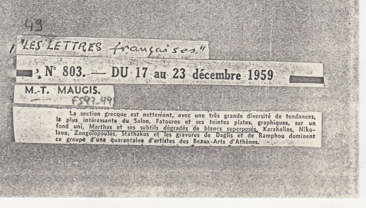 Φωτοαντίγραφο, χαρτί, 30×21 εκ., στα γαλλικά, δημοσίευσης άρθρου αναφερόμενου σε έργα των Φατούρου, Καραχάλιου, Μάρθα, Νικολάου, Ζογγολόπουλου, Σταθάκου, Δαγκλή, Ράμφου, στο πλαίσιο συμμετοχής τους στην έκθεση “Salon International d’ Art Libre”, στη Γαλλία.