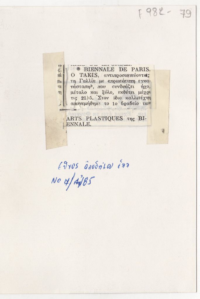 Φωτοαντίγραφο, χαρτί, 16×11 εκ., στα ελληνικά, δημοσίευσης άρθρου αναφερόμενου στη συμμετοχή- εκπροσώπηση της Γαλλίας από τον γλύπτη Τάκη (Παναγιώτη Βασιλάκη) στην Μπιεννάλε Παρισιού, με έργο του μουσικοκινητικής τέχνης.
