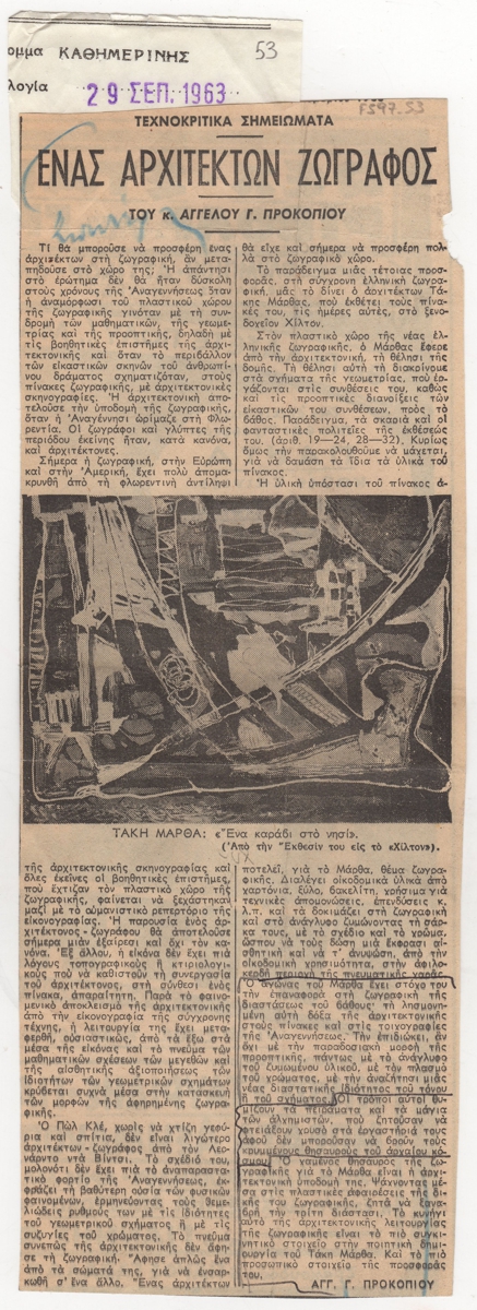 Απόκομμα, χαρτί, 30×10,5 εκ., στα ελληνικά, δημοσίευσης κριτικής έκθεσης του Τάκη Μάρθα, η οποία διεξάγεται στην Αίθουσα Τέχνης Αθηνών Χίλτον.