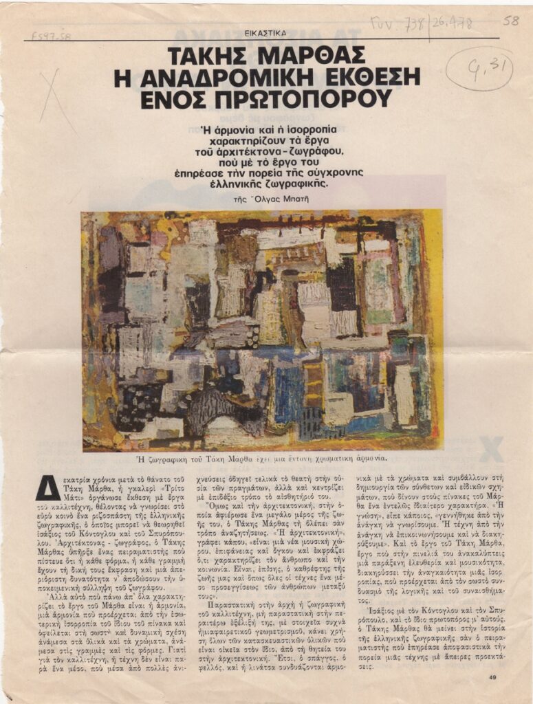 Απόκομμα, χαρτί ιλλουστρασιόν, 30×23 εκ., στα ελληνικά, δημοσίευσης κριτικής έκθεσης του Τάκη Μάρθα, η οποία διεξάγεται στην γκαλερί Το Τρίτο Μάτι στην Αθήνα.
