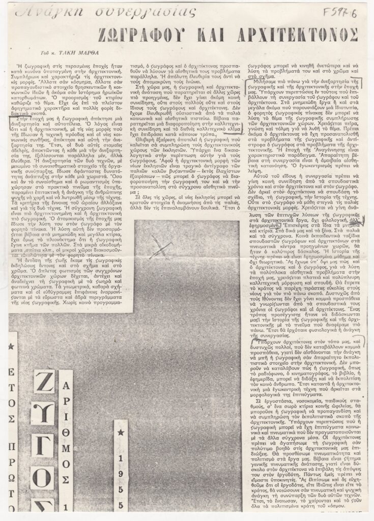 Φωτοαντίγραφο, χαρτί, 30×21 εκ., στα ελληνικά, δημοσίευσης άρθρου του Τάκη Μάρθα αναφερόμενου στη σχέση ζωγραφικής-αρχιτεκτονικής.