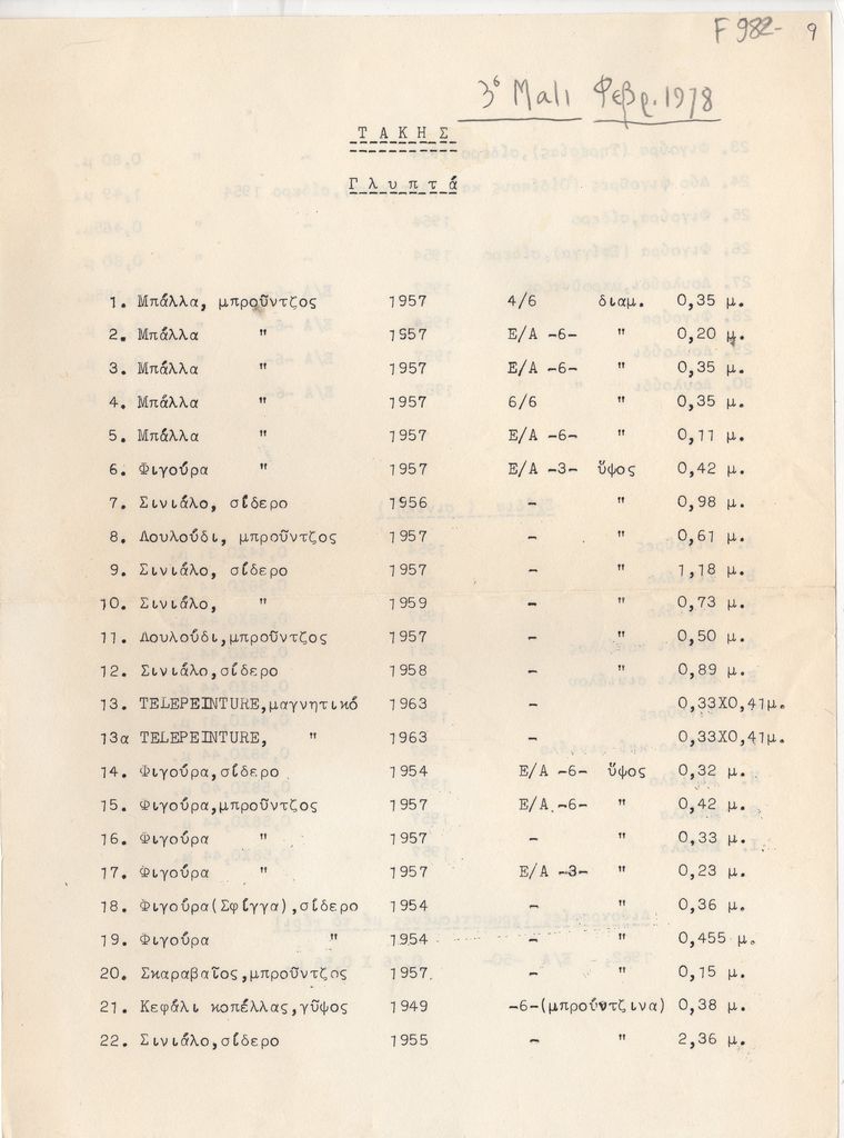 Κατάλογος, δακτυλόγραφο, χαρτί, 28,5×21 εκ., στα ελληνικά, έργων του Τάκη (Παναγιώτη Βασιλάκη).