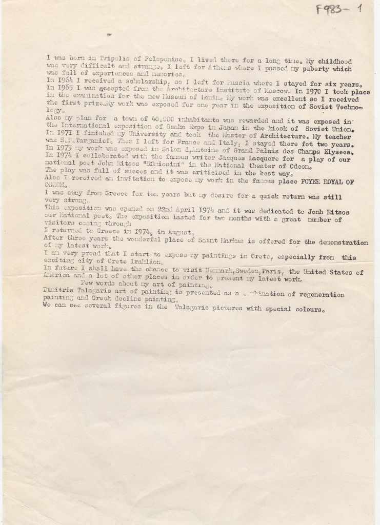 Φωτοαντίγραφο δακτυλόγραφου βιογραφικού σημειώματος, χαρτί, 29.5×21 εκ., στα αγγλικά, του Δημήτρη Ταλαγάνη.