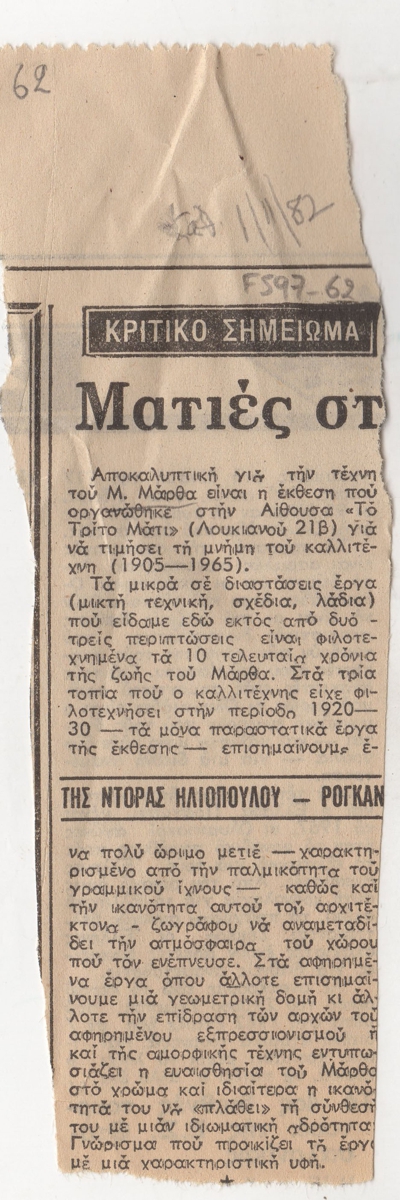 Απόκομμα, χαρτί, 17×5,5 εκ., στα ελληνικά, δημοσίευσης κριτικής αναδρομικής έκθεσης του Τάκη Μάρθα, η οποία διεξάγεται στην Γκαλερί Το Τρίτο Μάτι στην Αθήνα, στην μνήμη του. Εντάσσεται στην ομώνυμη στήλη “Κριτικό Σημείωμα- Ματιές στις εκθέσεις” του εντύπου.