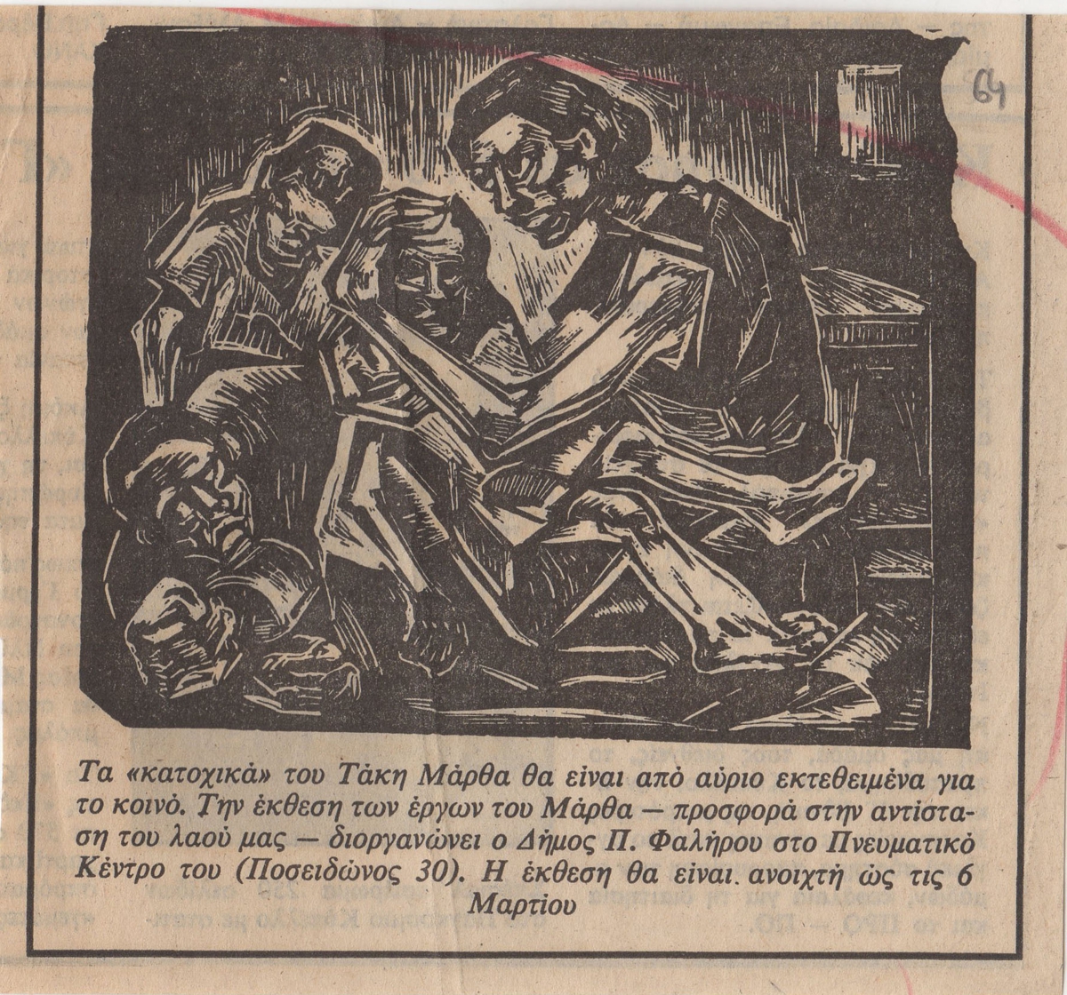 Απόκομμα, χαρτί, 10,5×11,5 εκ., στα ελληνικά, δημοσίευσης αναπαραγωγή έργου και λεζάντας εικονογράφησης αναφερόμενης σε ατομική έκθεση έργων του Τάκη Μάρθα στο Πνευματικό Κέντρο Παλαιού Φαλήρου στην Αθήνα το 1983.