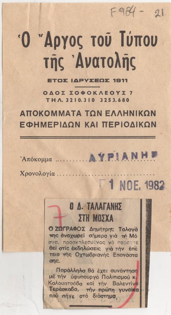 Απόκομμα, χαρτί ακανόνιστου μεγέθους, στα ελληνικά, δημοσίευσης άρθρου αναφερόμενου σε ταξίδι του Δημήτρη Ταλαγάνη στη Μόσχα, όπου προσκλήθηκε στις εκδηλώσεις επετείου της Οκτωβριανής Επανάστασης.