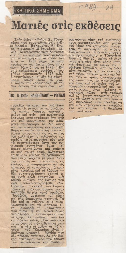 Απόκομμα, χαρτί ακανόνιστου μεγέθους, στα ελληνικά, δημοσίευσης κριτικής έκθεσης στη μνήμη του Σάββα Τζανετάκη, η οποία διοργανώνεται στην γκαλερί Νέες Μορφές στην Αθήνα και όπου πρωταγωνιστούν έργα του καλλιτέχνη.