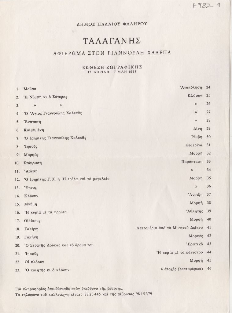 Κατάλογος, χαρτί, 29×21 εκ., στα ελληνικά, έργων του Δημήτρη Ταλαγάνη, που παρουσιάζονται σε έκθεσή του στην Αθήνα, η οποία είναι αφιερωμένη στον Γιαννούλη Χαλεπά.