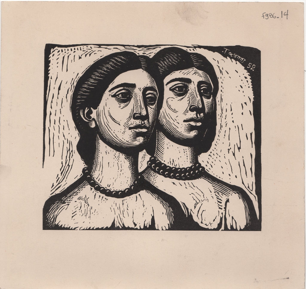 Χαρακτικό του A. Τάσσου “Κορίτσια”, σε χαρτόνι, 16,0×17,0 εκ. Στην πίσω όψη, επιγραφή με τα στοιχεία του έργου.