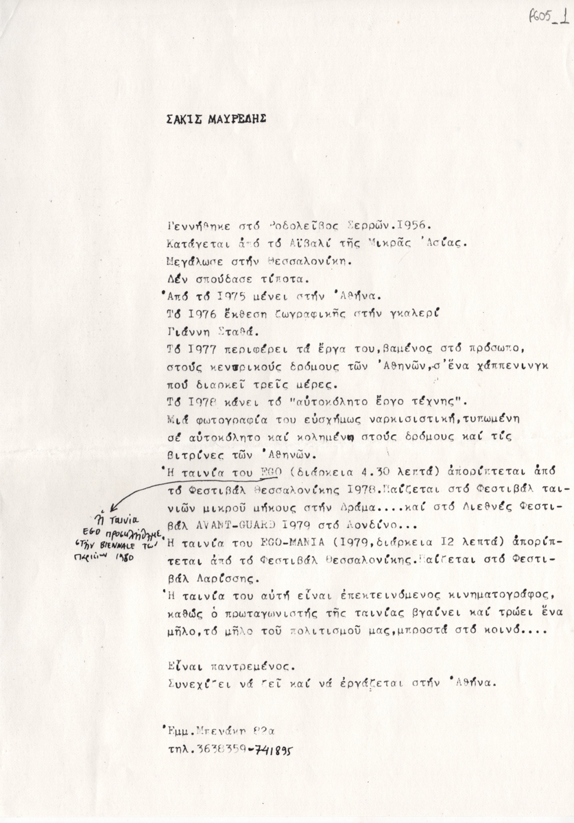 Κείμενο, δακτυλόγραφο, στα ελληνικά, χαρτί, 29,7×21,0 εκ. Βιογραφικό σημείωμα του ζωγράφου και performance artist Σάκι Μαυρέλη. Το κείμενο φέρει χειρόγραφη συμπλήρωση.