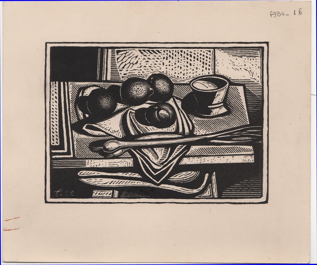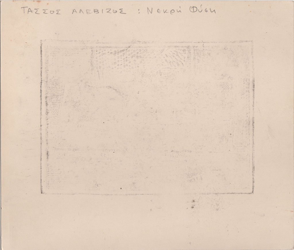 Χαρακτικό του A. Τάσσου “Νεκρή φύση”, χαρτόνι, 15,0×17,3 εκ. Στην πίσω όψη, επιγραφή με τα στοιχεία του έργου.