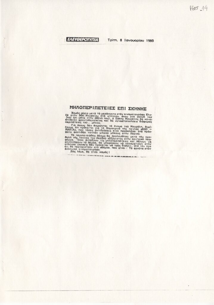 Φωτοαντίγραφο απόκομματος εφημερίδας, στα ελληνικά, χαρτί, 29,8×21,3 εκ. Αναγγελία της προβολής της κινηματογραφικής ταινίας – εικαστικού δρώμενου του Σάκι Μαυρέλη “Ego – mania” στην Αθήνα το 1980.