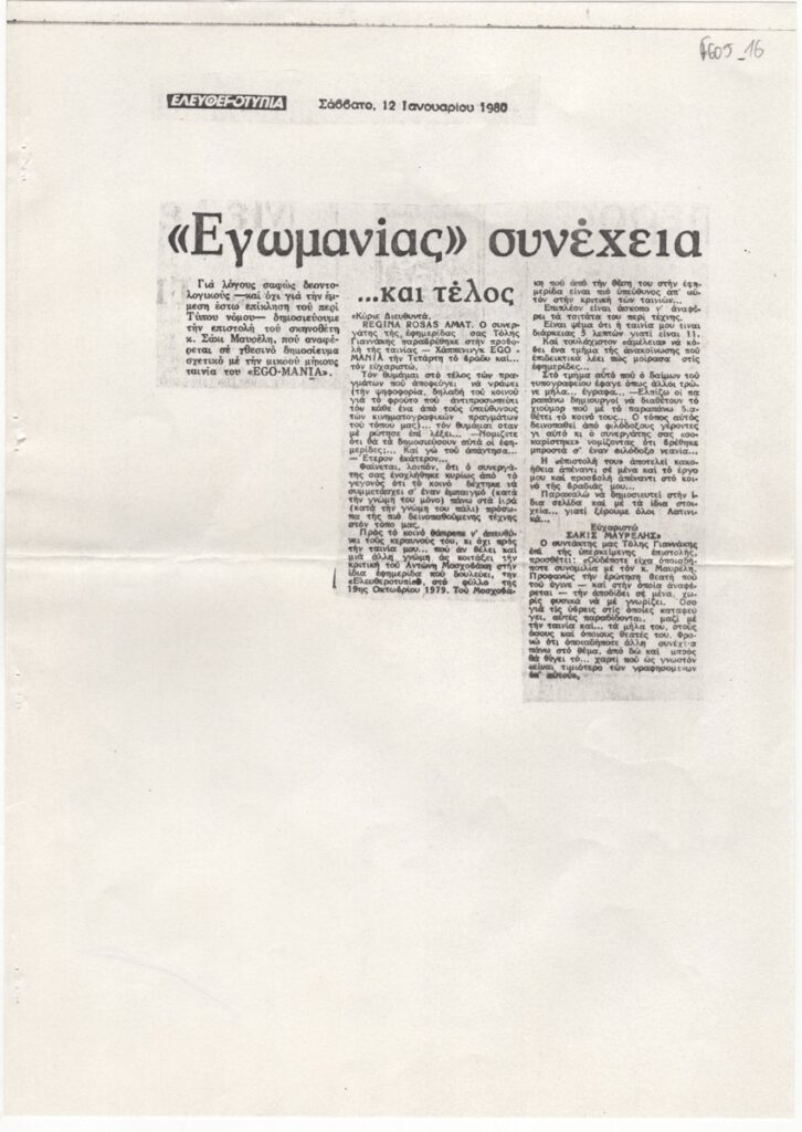 Φωτοαντίγραφο αποκόμματος εφημερίδας, στα ελληνικά, χαρτί, 29,7×21,0 εκ. Δημοσίευση απαντητικής επιστολής του ζωγράφου Σάκι Μαυρέλη στην κριτική του Τόλη Γιαννάκη για την κινηματογραφική προβολή / εικαστικό δρώμενο του καλλιτέχνη με τίτλο “Ego – Mania”.