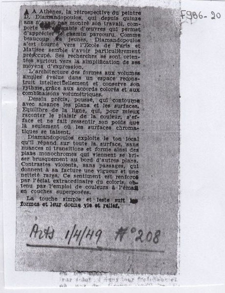 Φωτοαντίγραφο αποκόμματος, έντυπο, χαρτί, 11,3×9,0 εκ., όπου δημοσιεύεται, στα γαλλικά, κριτική της αναδρομικής έκθεσης ζωγραφικής του Διαμαντή Διαμαντόπουλου στην Αθήνα το 1949. Κάτω, επιγραφή με τα στοιχεία της δημοσίευσης.