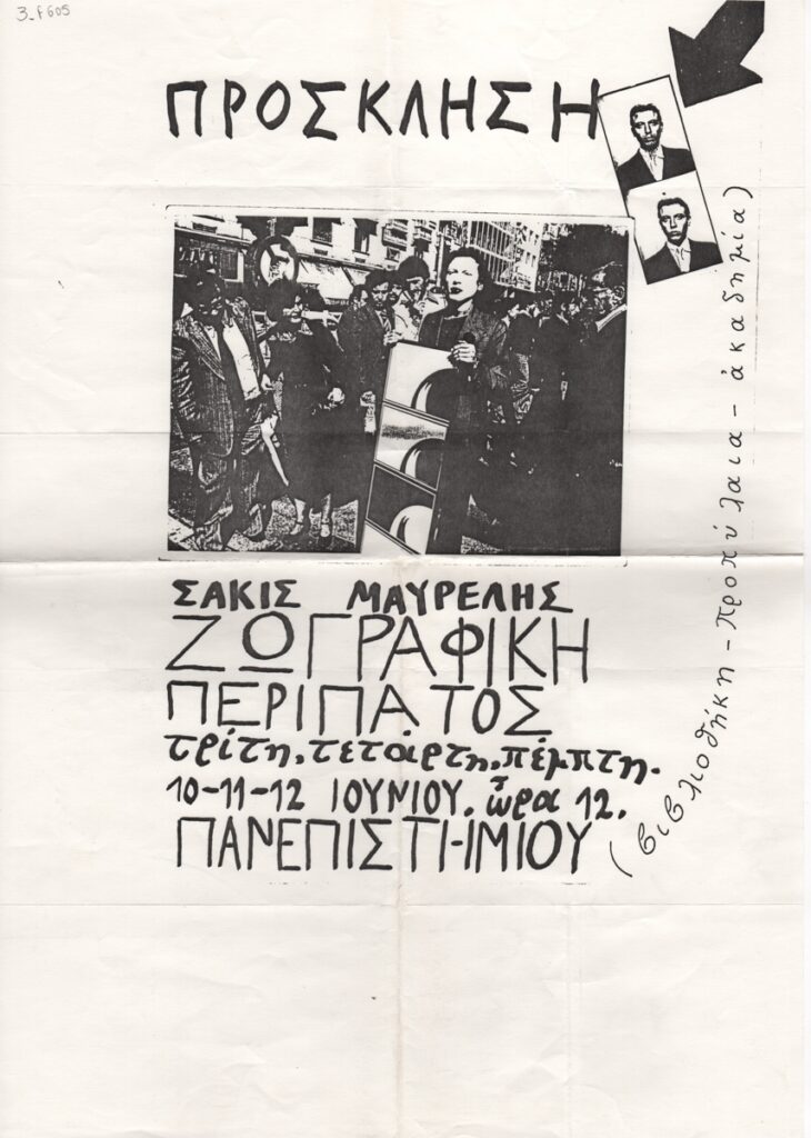 Φωτοαντίγραφο εντύπου έκθεσης, στα ελληνικά, μονόφυλλο, χαρτί, 48,0×29,8 εκ. Πρόσκληση του εικαστικού δρώμενου του ζωγράφου Σάκι Μαυρέλη στην Αθήνα το 1977. Εικονογραφείται με αναπαραγωγή φωτογραφίας.