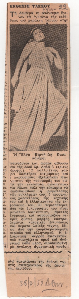 Απόκομμα της εφημερίδας “Αθηναϊκή” (28/02/1953) όπου δημοσιεύεται, στα ελληνικά, κριτική για τα ατομική έκθεση του χαράκτη Α. Τάσσου στην Αθήνα.