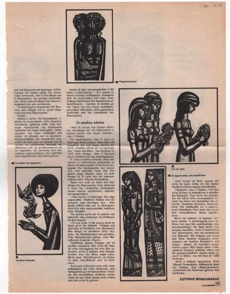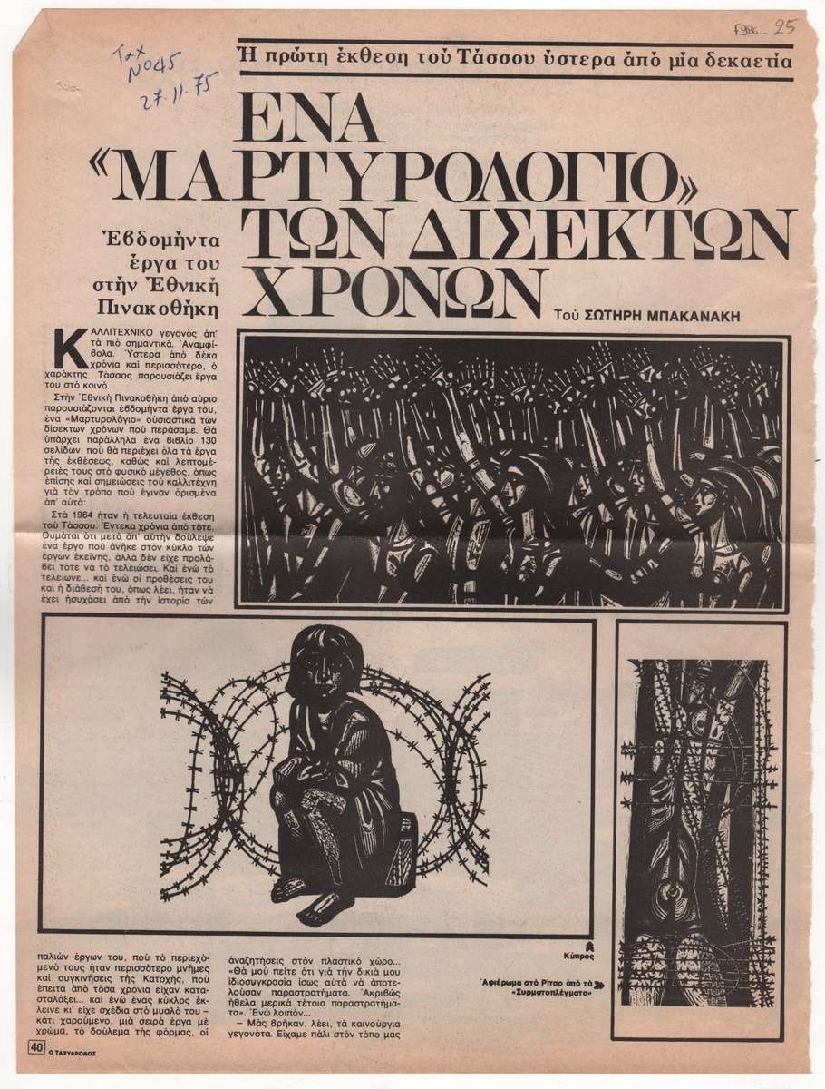 Απόκομμα του περιοδικού “Ο Ταχυδρόμος” (27/11/1975) όπου δημοσιεύεται άρθρο του Σωτήρη Μπακανάκη για τον χαράκτη Τάσσο με αφορμή την έκθεση 70 έργων του στην Αθήνα. Περιέχει αποσπάσματα συνέντευξης.