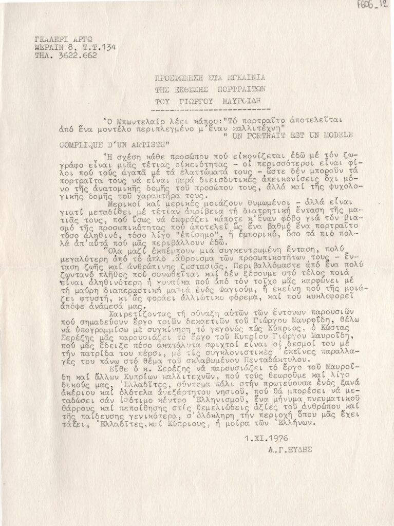 Κείμενο, δακτυλόγραφο, στα ελληνικά, χαρτί, 28,8×21,5 εκ. Το κείμενο της προσφώνησης του Αλέξανδρου Γ. Ξύδη στα εγκαίνια της έκθεσης ζωγραφικής του Γιώργου Μαυροΐδη με τίτλο “Μορφές των τριάντα τελευταίων χρόνων” στην Αθήνα του 1976. Παρατίθεται απόσπασμα κειμένου του Baudelaire στα ελληνικά και γαλλικά.