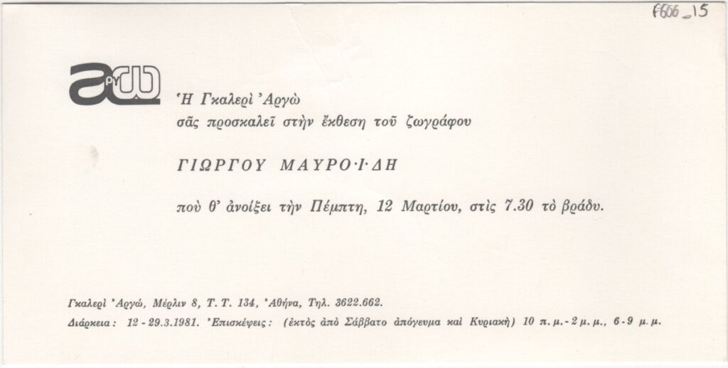 Πρόσκληση εγκαινίων έκθεσης, στα ελληνικά, μονόφυλλο, χαρτόνι, 10×19,8 εκ. Πρόσκληση εγκαινίων της ατομικής έκθεσης ζωγραφικής του Γιώργου Μαυροΐδη στην Αθήνα το 1981.