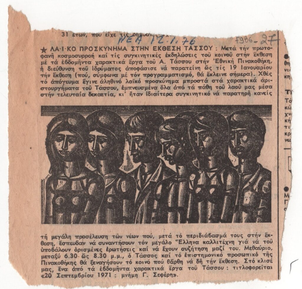 Απόκομμα της εφημερίδας “Τα Νέα” (12/01/1976) όπου δημοσιεύεται αναγγελία της παράτασης της έκθεσης του χαράκτη Τάσσου στην Αθήνα.