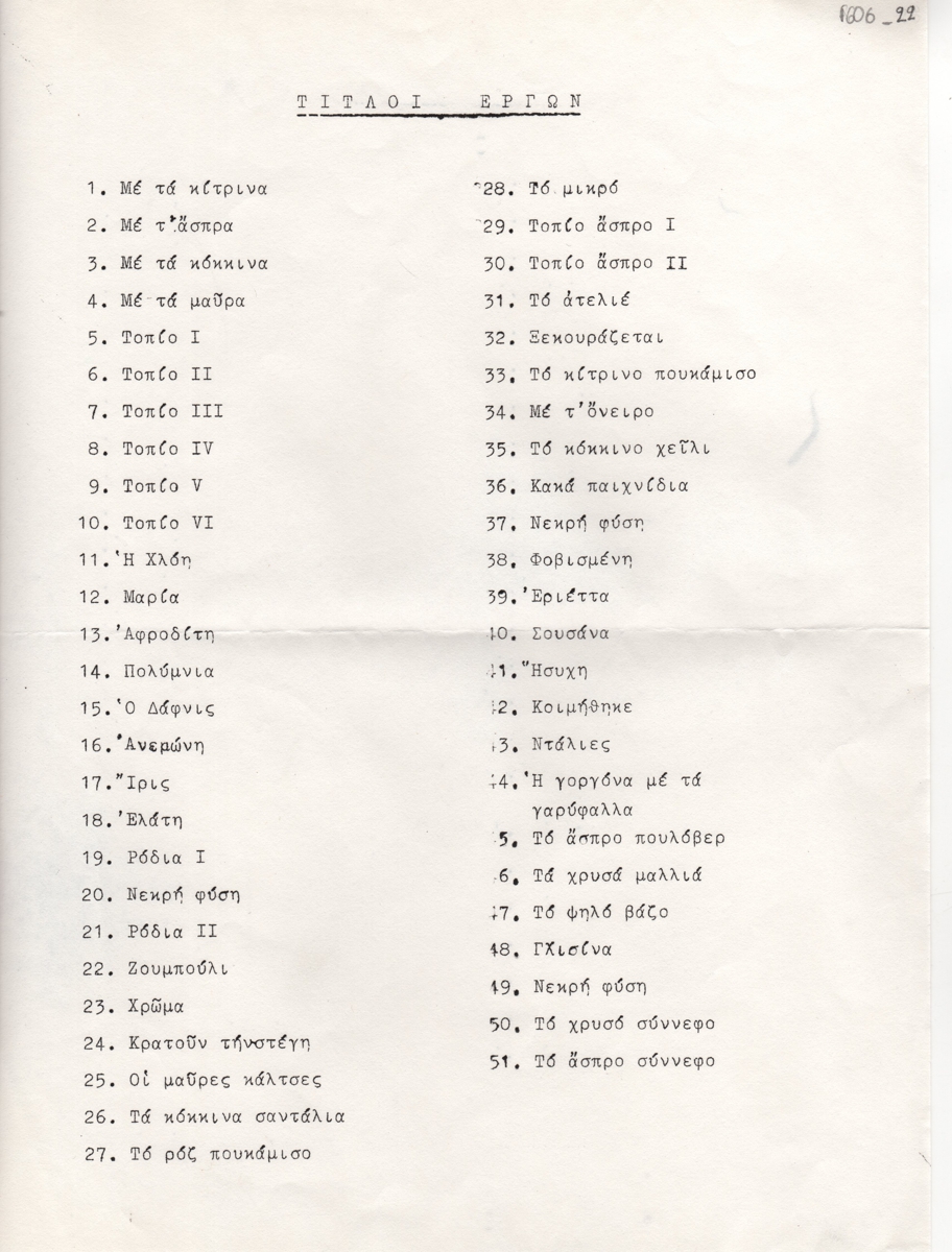 Κείμενο, δακτυλόγραφο, στα ελληνικά, χαρτί, 29,0×21,5 εκ. Κατάλογος έργων έκθεσης (;) του Γιώργου Μαυροΐδη.