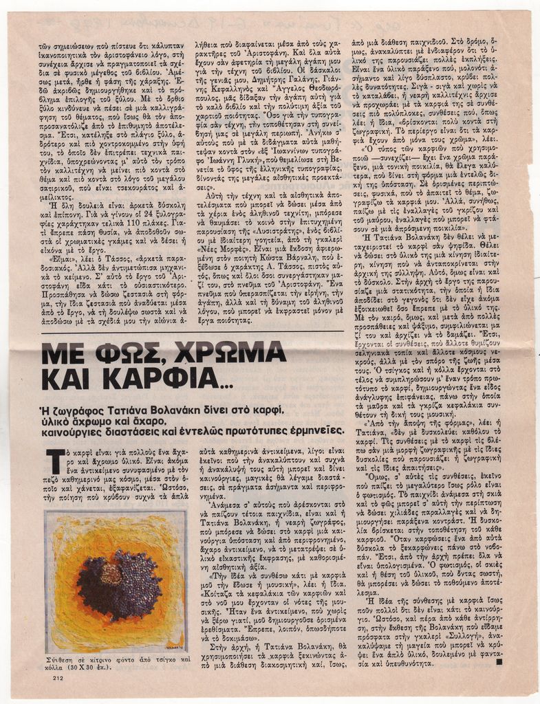 Απόκομμα, έντυπο, χαρτί ιλουστρασιόν, 29,5×23,0 εκ. όπου δημοσιεύεται, στα ελληνικά, κριτική για την ατομική έκθεση της Τατιάνας Βολανάκη στην Αθήνα το 1978.