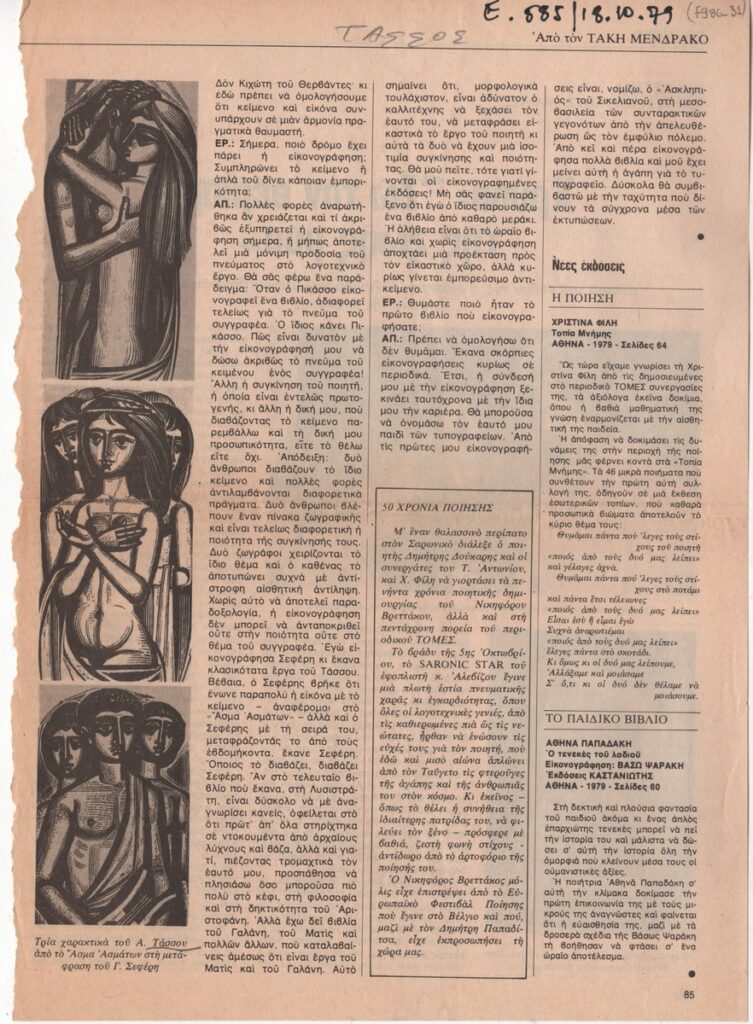 Απόκομμα του περιοδικού “Επίκαιρα” (18/10/1979) όπου δημοσιεύεται συνέντευξη του χαράκτη Α. Τάσσου στον Τάκη Μενδράκο. Περιέχει σύντομο βιογραφικό καλλιτέχνη.