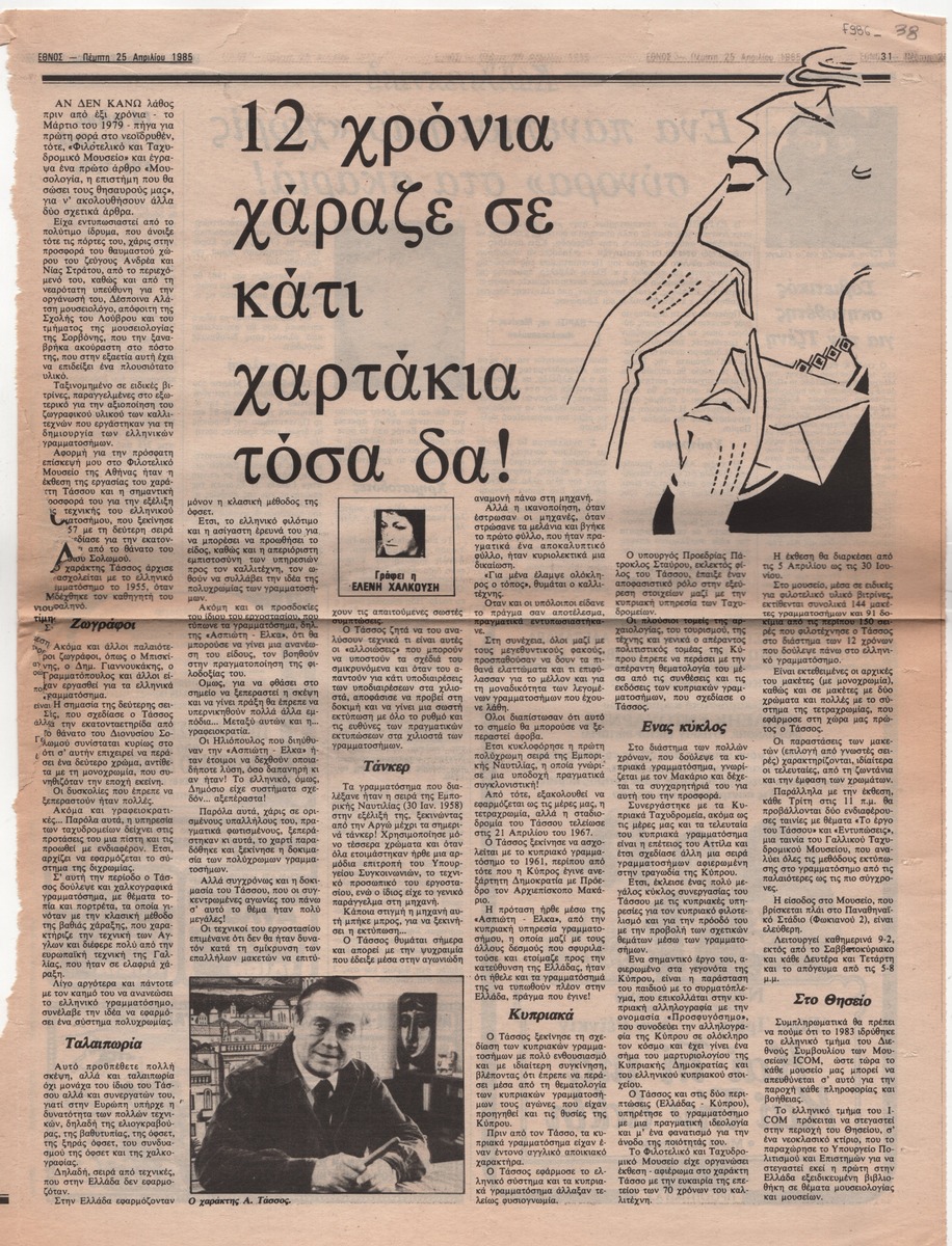 Απόκομμα της εφημερίδας “Έθνος” (25/04/1985) όπου δημοσιεύεται άρθρο της Ελένης Χαλκούση για τον χαράκτη Α. Τάσσο με αφορμή τα εγκαίνια της έκθεσης γραμματοσήμων του καλλιτέχνη στο Φιλοτελικό Μουσείο της Αθήνας.