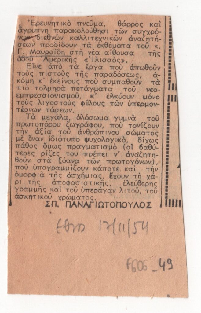 Απόκομμα εφημερίδας, στα ελληνικά, χαρτί, 9,0×6,0 εκ. Κριτική του Σπ. Παναγιωτόπουλου για την ατομική έκθεση ζωγραφικής του Γιώργου Μαυροΐδη στην Αθήνα το 1954. Κάτω από το κείμενο επιγραφή με τα στοιχεία της δημοσίευση.