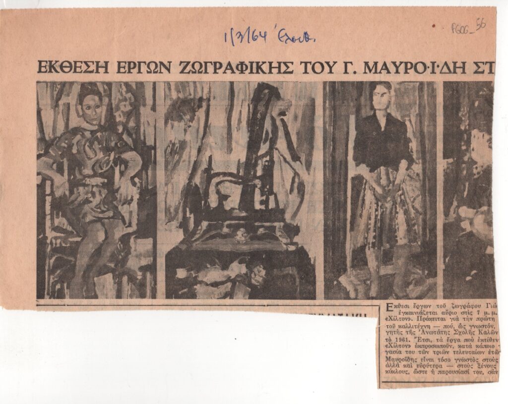 Απόκομμα εφημερίδας, στα ελληνικά, 16,8×21,5 εκ. Αναγγελία των επικείμενων εγκαινίων της ατομικής έκθεσης ζωγραφικής του Γιώργου Μαυροΐδη στην Αθήνα το 1964. Το μεγαλύτερο μέρος του άρθρου έχει αφαιρεθεί κατά την αποδελτίωση. Εικονογραφείται με αναπραγωγές έργων. Επάνω, επιγραφή με τα στοιχεία της δημοσίευσης.