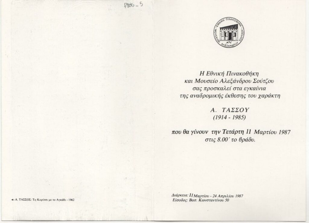Πρόσκληση αναδρομικής έκθεσης του χαράκτη Α. Τάσσου Εθνική Πινακοθήκη και Μουσείο Αλεξάνδρου Σούτζου στην Αθήνα.