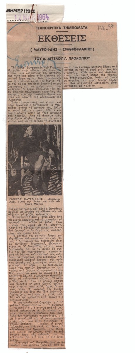 Απόκομμα εφημερίδας, στα ελληνικά, χαρτί, 29,0×10,0 εκ. Κριτική του Άγγελου Προκοπίου για την ατομική έκθεση ζωγραφικής του Γιώργου Μαυροΐδη στην Αθήνα το 1964. Εικονογραφείται με αναπαραγωγή έργου. Επάνω, επικολλημένο απόκομμα με τα στοιχεία της δημοσίευσης και επιγραφή. Η κριτική για την έκθεση του Σταυρουλάκη έχει αφαιρεθεί κατά την αποδελτίωση.
