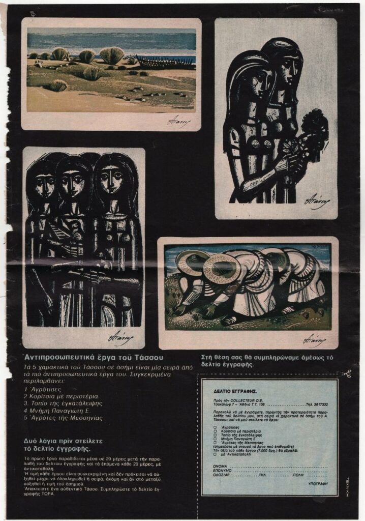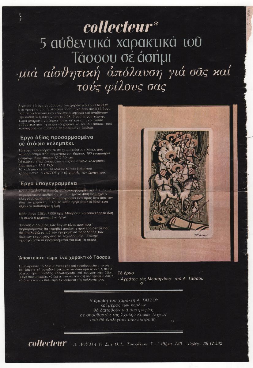 Απόκομμα περιοδικού, όπου δημοσιεύεται διαφημιστική καταχώριση της εταιρίας Collecter για την αναπαραγωγή 5 αυθεντικών χαρακτικών του Τάσσου σε ασήμι.