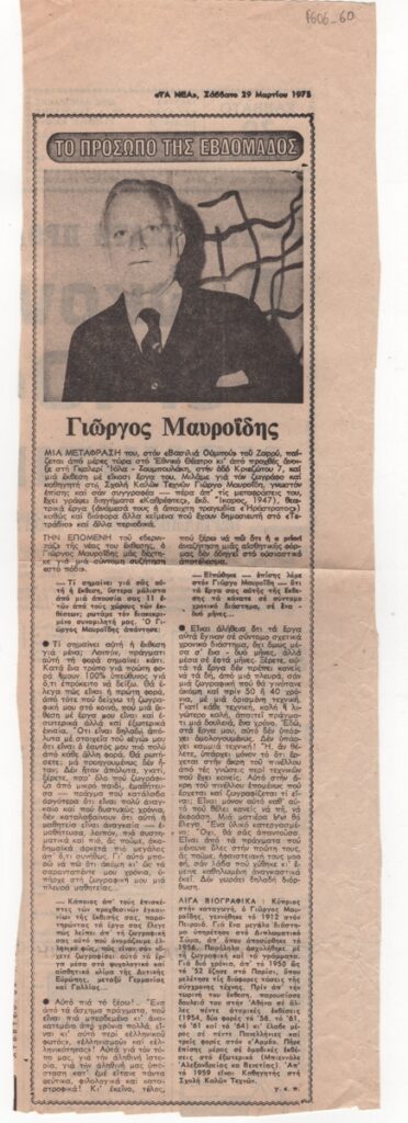Απόκομμα εφημερίδας, στα ελληνικά, χαρτί, 38,0×12,5 εκ. Συνέντευηξη του Γ. Κ. Π. με τον ζωγράφος Γιώργο Μαυροΐδη με αφορμή τα εγκαίνια της ατομικής του έκθεσης ζωγραφικής στην Αθήνα το 1975, που συνέπεσε χρονικά με τις παραστάσεις του έργου του Ζαρρύ με τίτλος “Βασιλιάς Ουμπού” από το Εθνικό Θέατρο σε μετάφραση του καλλιτέχνη. Το δημοσίευμα εντάσσεται στη στήλη “Το πρόσωπο της εβδομάδας”. Εικονογραφείται με φωτογραφία του καλλιτέχνη.