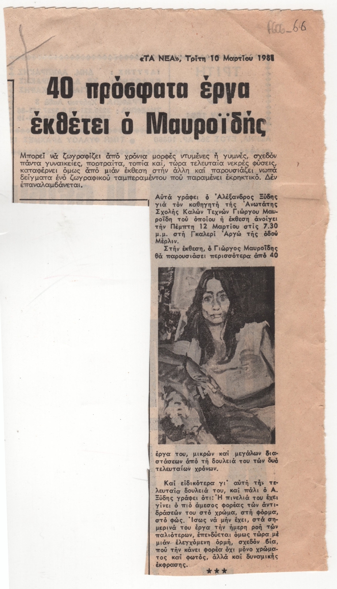 Απόκομμα εφημερίδας, στα ελληνικά, χαρτί, 21,0×11,8 εκ. Παρουσίαση της ατομικής έκθεσης ζωγραφικής του Γιώργου Μαυροΐδη στην Αθήνα το 1981. Περιέχει αποσπάσματα κριτικής του Α. Ξύδη. Εικονογραφείται με αναπαραγωγή έργου.