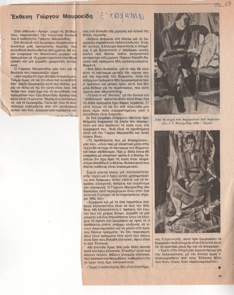Απόκομμα περιοδικού, στα ελληνικά, χαρτί, 25,6×21,0 εκ. Συνέντευξη του Γιώργου Μαυροΐδη με αφορμή την ατομική του έκθεση έργων ζωγραφικής στην Αθήνα το 1981. Εικονογραφείται με αναπαραγωγές έργων. Επάνω, επιγραφή με τα στοιχεία της δημοσίευσης.