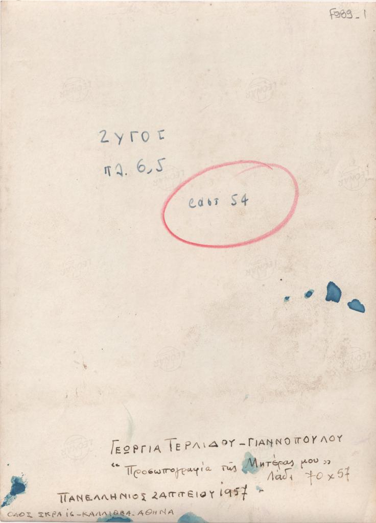 Φωτογραφία, α/μ, φωτογραφικό χαρτί, 18,0×13,0 εκ. Αναπαραγωγή του έργου της Γεωργίας Τερλίδου-Γιαννοπούλου «Προσωπογραφία της μητέρας μου». Στην πίσω όψη, επιγραφή, όπου αναφέρεται ότι παρουσιάστηκε στην Πανελλήνιο Έκθεση του Ζαππείου το 1957.