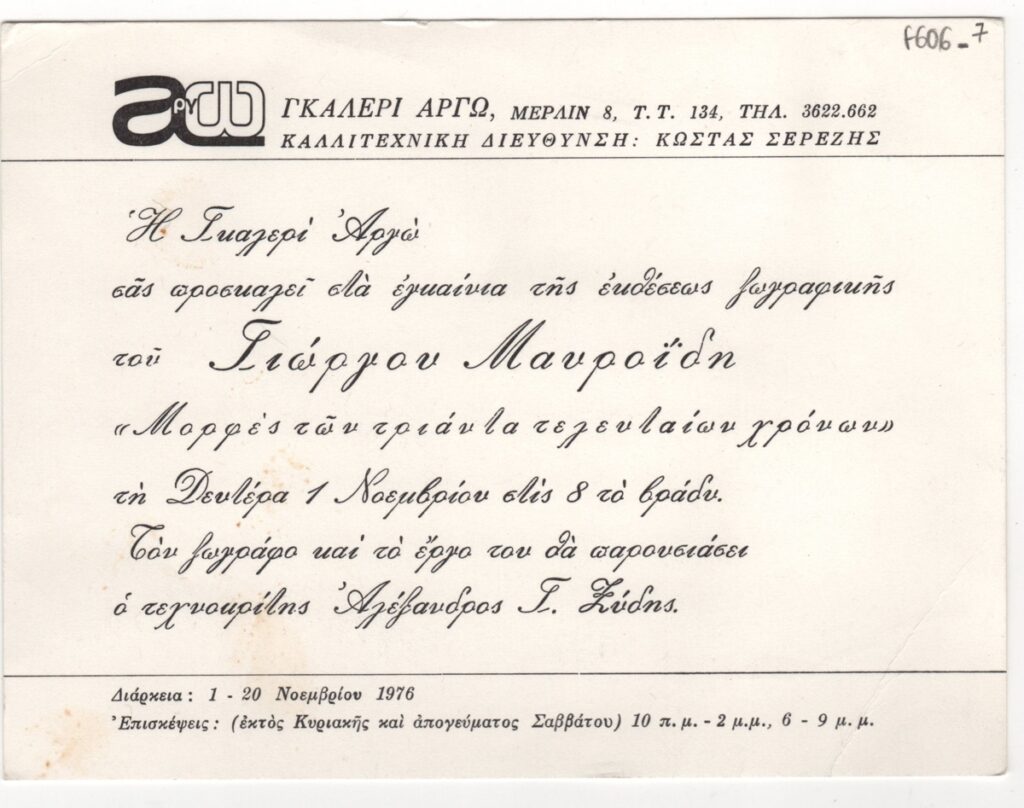 Έντυπο έκθεσης, στα ελληνικά, μονόφυλλο, χαρτόνι, 12,5×16,4 εκ. Πρόσκληση εγκαινίων της ατομικής έκθεσης ζωγραφικής του Γιώργου Μαυροΐδη με τίτλο “Μορφές των τριάντα τελευταίων χρόνων” στην Αθήνα το 1976. Τον ζωγράφο παρουσίασε ο τεχνοκρίτης Αλέξανδρος Γ. Ξύδης.