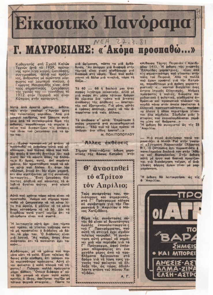 Απόκομμα εφημερίδας, στα ελληνικά, χαρτί, 12,4×15,2 εκ. Συνέντευξη του ζωγράφου Γιώργου Μαυροΐδη με αφορμή την ατομική έκθεσης έργων του στην Αθήνα το 1981. Στο ίδιο άρθρο δημοσιεύεται κριτική της ατομικής έκθεσης χαρακτικής της Βάσως Κατράκη στον Πειραιά και η ατομική έκθεση ανάγλυφων πανώ του Michel Roux. Κάτω, σύντομο δημοσίευμα με τίτλο “Θ’αναστηθεί το ‘Τρίτο’ τον Απρίλιο;” σχετικά με την επαναλειτουργία του Γ’ προγράμματος ραδιοφώνου. Επάνω, επιγραφή με τα στοιχεία της δημοσίευσης.