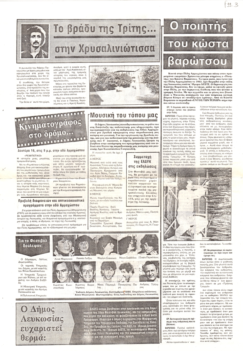 Φωτοαντίγραφο, χαρτί, 42×30 εκ., στα ελληνικά, συνέντευξης του Κώστα Βαρώτσου, αναφορικά με άγαλμα που δημιουργήσε και το οποίο δωρήθηκε από το Ίδρυμα ΔΕΣΤΕ. Το έντυπο φέρει τίτλο “Η οδός Αμμοχώστου…ζει” και περιλαμβάνει τις εκδηλώσεις που πραγματοποιήθηκαν κατά τη διάρκεια του Φεστιβάλ.