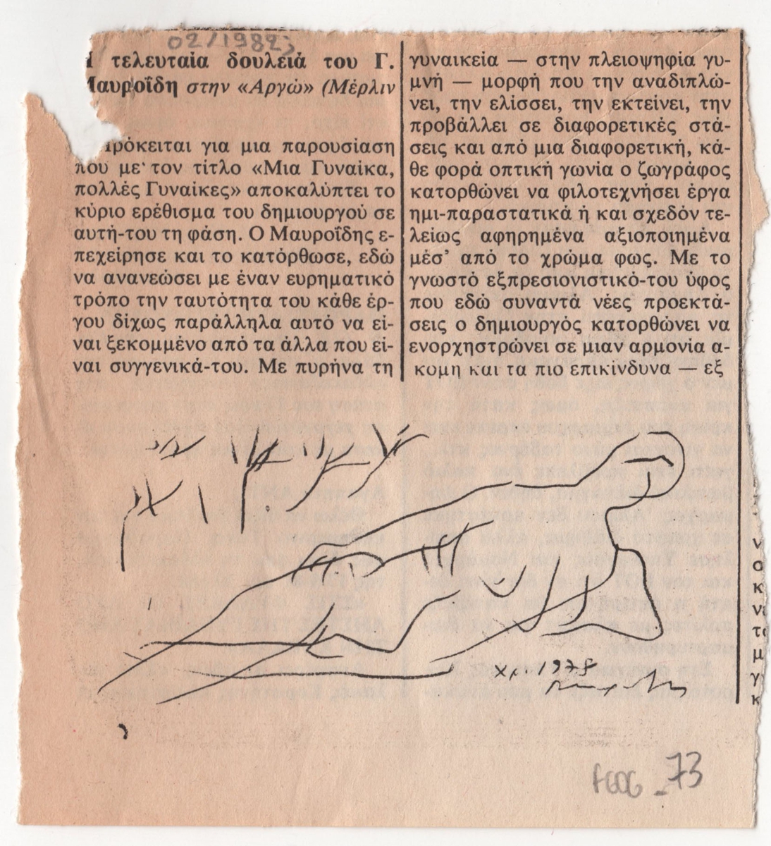 Απόκομμα εντύπου, στα ελληνικά, χαρτί, 2 φφ., 10,8×10,3 και 11,0×5,0 εκ. Κριτική της ατομικής έκθεσης ζωγραφικής του Γιώργου Μαυροΐδη με τίτλο “Μία Γυναίκα, πολλές Γυναίκες”, στην Αθήνα [το 1982]. Εικονογραφείται με αναπαραγωγή έργου.