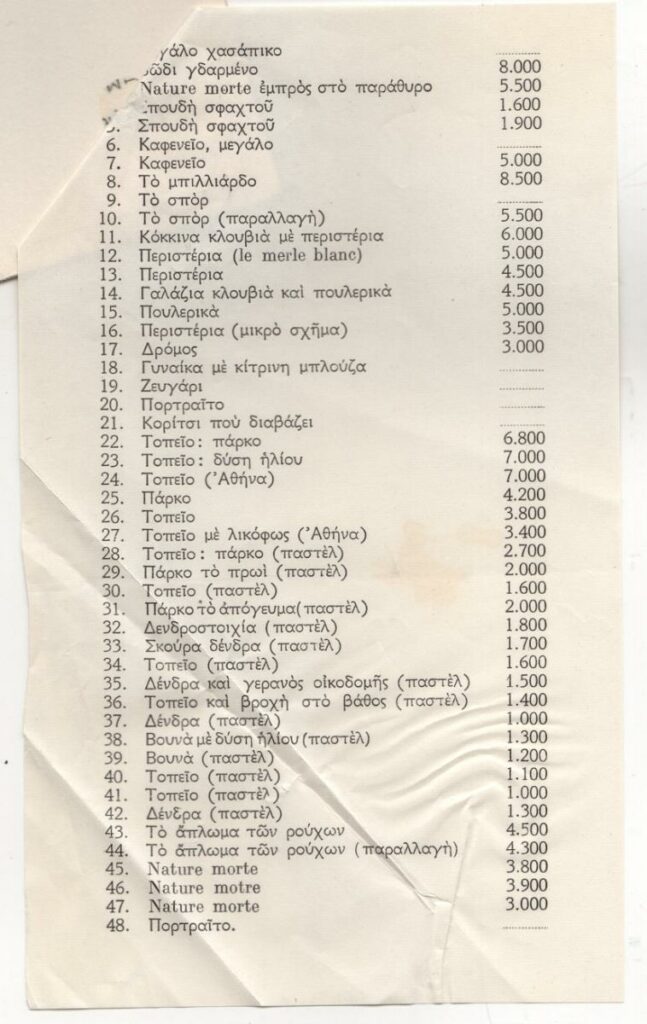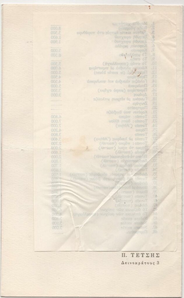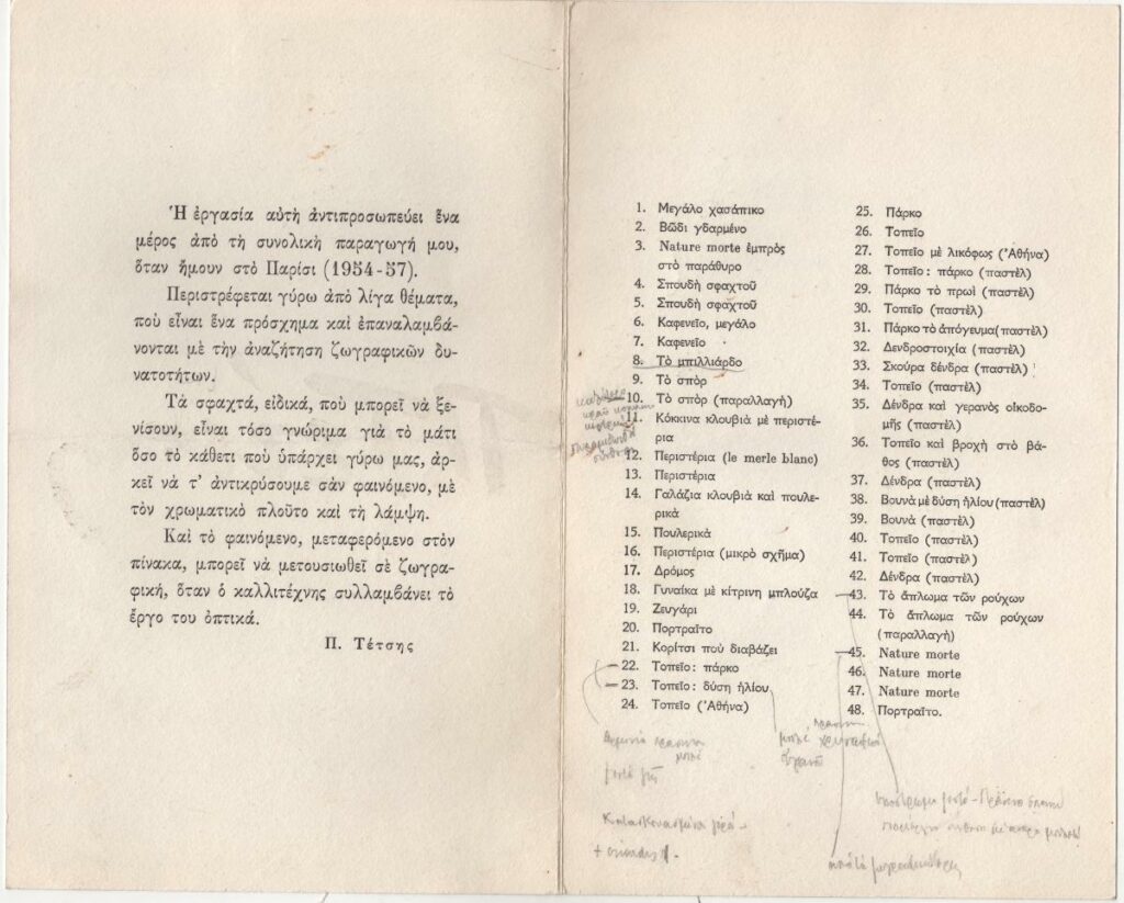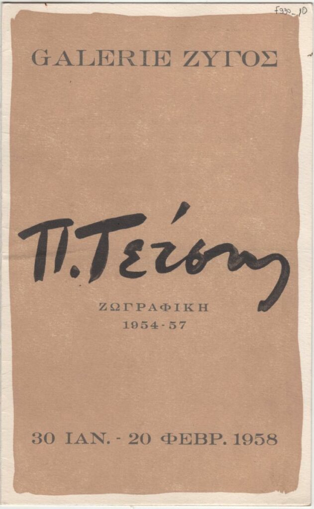 Έντυπο της ατομικής έκθεσης ζωγραφικής του Παναγιώτη Τέτση στην Γκαλερί Ζυγός στην Αθήνα. Περιέχει κείμενο του καλλιτέχνη. Στο οπισθόφυλλο επικολλημένος τιμοκατάλογος έργων. Χειρόγραφες σημειώσεις κριτικής του Τώνη Σπητέρη.