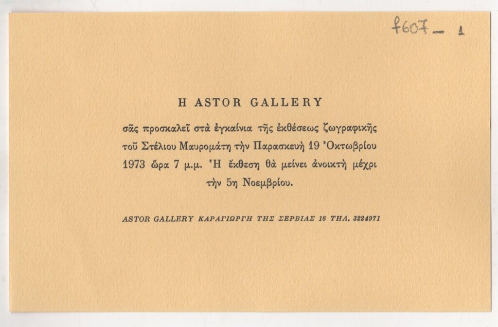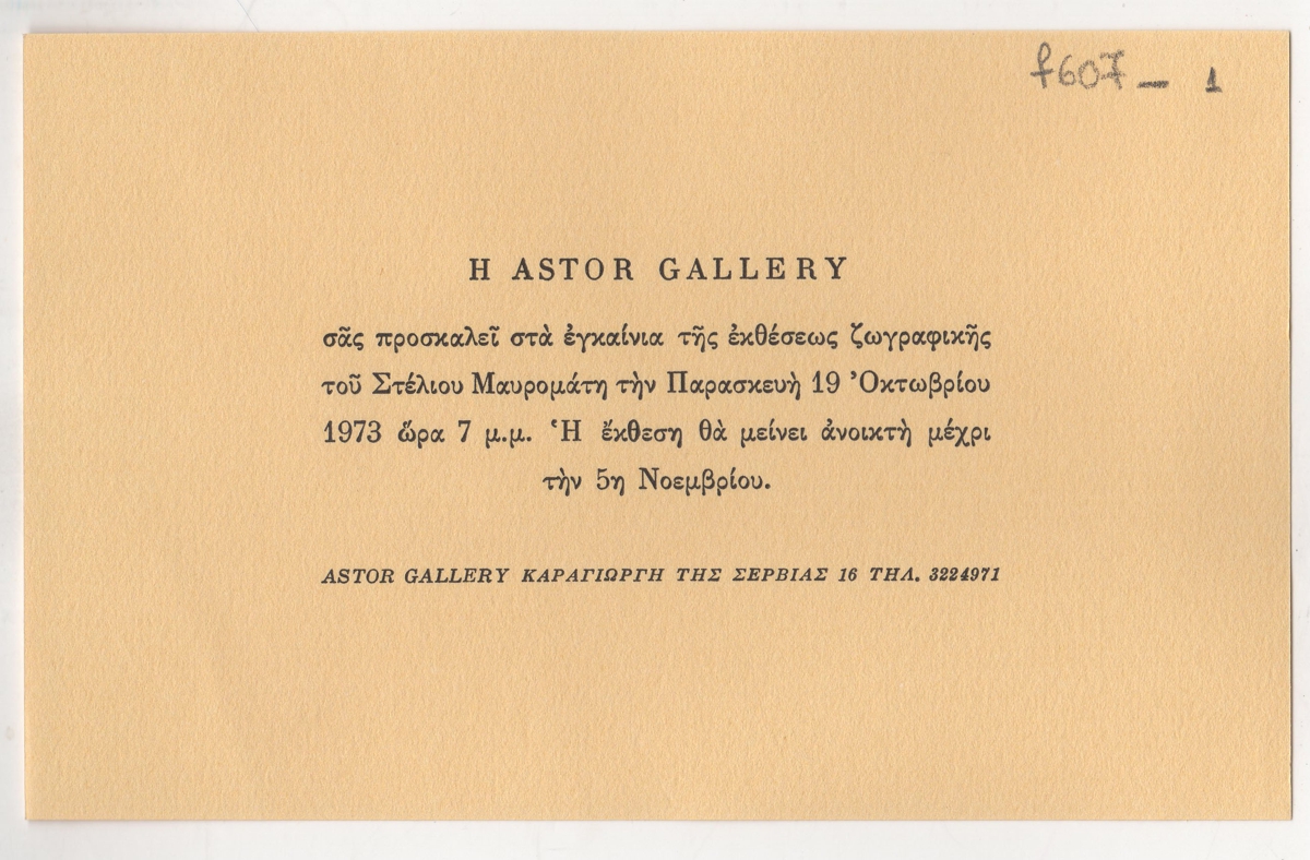 Πρόσκληση, χαρτόνι, 10×16 εκ., στα ελληνικά, εγκαινίων ατομικής έκθεσης ζωγραφικής του Στέλιου Μαυρομάτη.