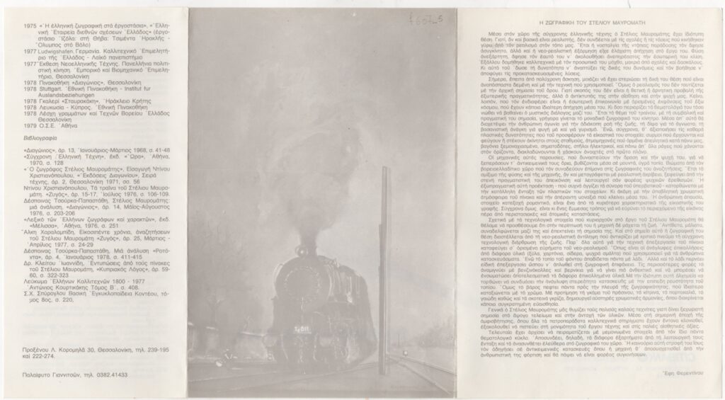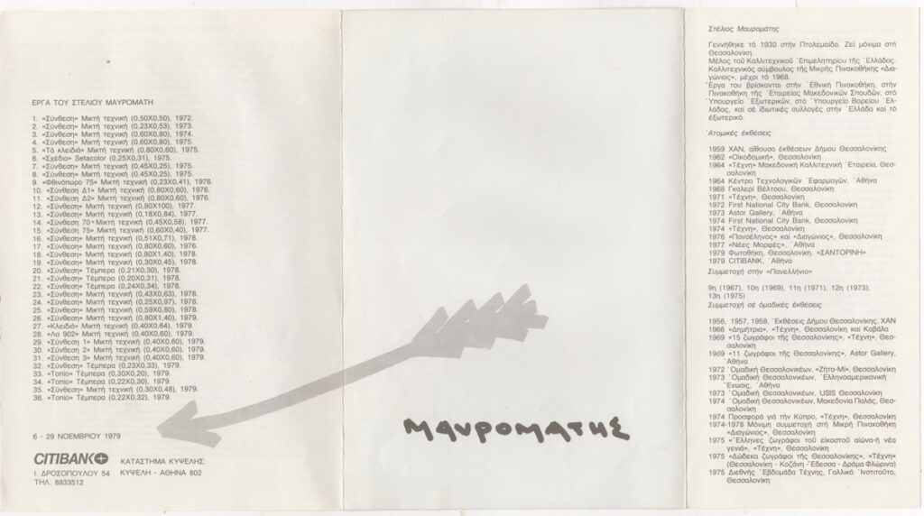 Έντυπο, χαρτί ιλλουστρασιόν δίπτυχο, στα ελληνικά, ατομικής έκθεσης ζωγραφικής του Στέλιου Μαυρομάτη. Περιέχει βιογραφικό σημείωμα του καλλιτέχνη, λίστα έργων, κείμενο της Έφης Φερεντίνου με τίτλο “Η ζωγραφική του Στέλιου Μαυρομάτη” και εικονογράφηση.
