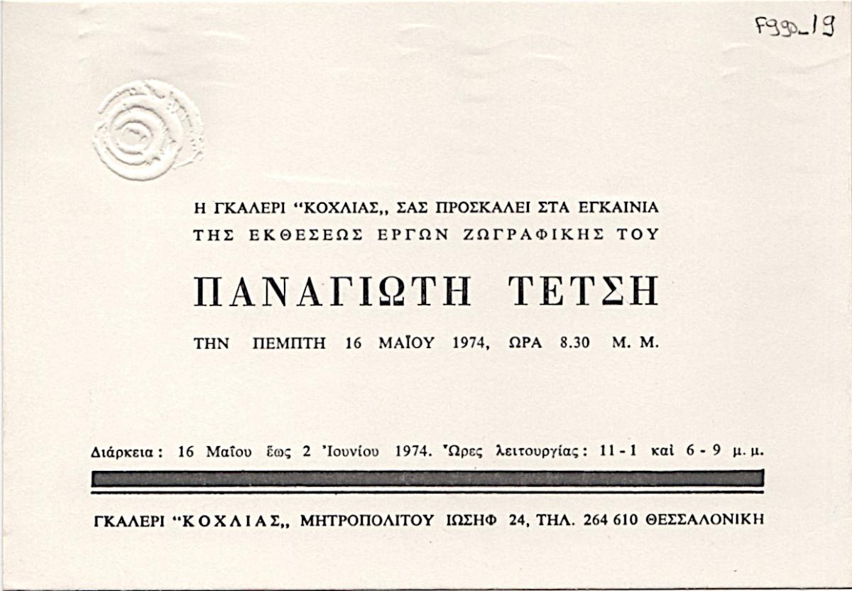 Πρόσκληση της ατομικής έκθεσης ζωγραφικής του Παναγιώτη Τέτση στην Γκαλερί “Κοχλίας” στην Θεσσαλονίκη.