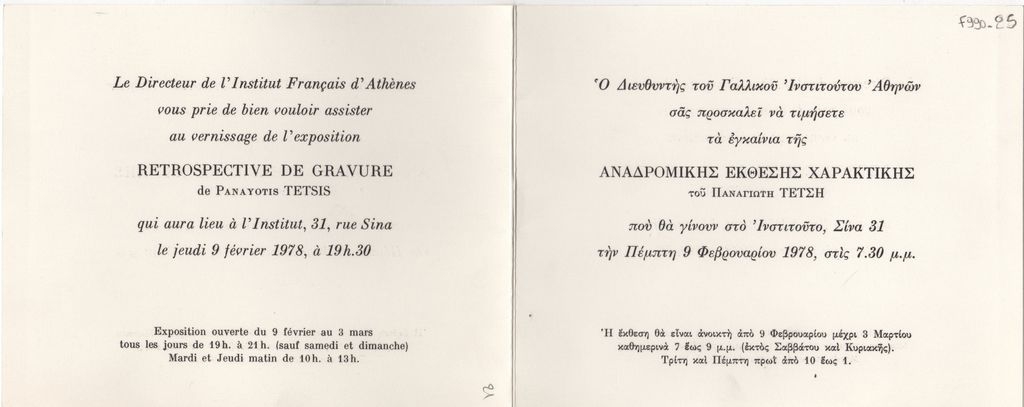 Έντυπο, στα ελληνικά και γαλλικά, δίπτυχο, χαρτόνι., 11,5×14,5 εκ. Πρόσκληση εγκαινίων της αναδρομικής έκθεσης χαρακτικής του Παναγιώτη Τέτση στην Αθήνα το 1978.