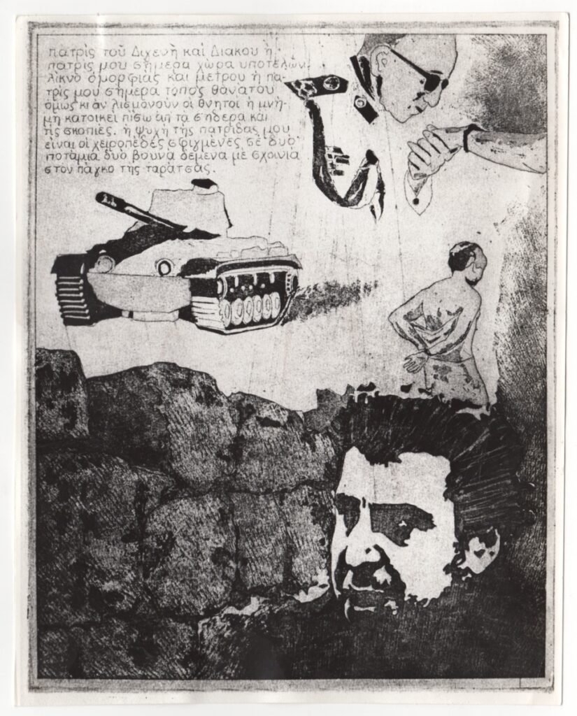 Φωτογραφία, α/μ, σε φωτογραφικό χαρτί, 21,7×17,2 εκ. Αναπαραγωγή έργου του χαράκτη Γιώργου Αργυράκη. Επάνω αριστερά απόσπασμα από το τραγούδι του Μίκη Θεοδωράκη “Στον Άγνωστο ποιητή”, από τον κύκλο Αρκαδία VI, που συνέθεσε κατά την περίοδο 1968-1969.