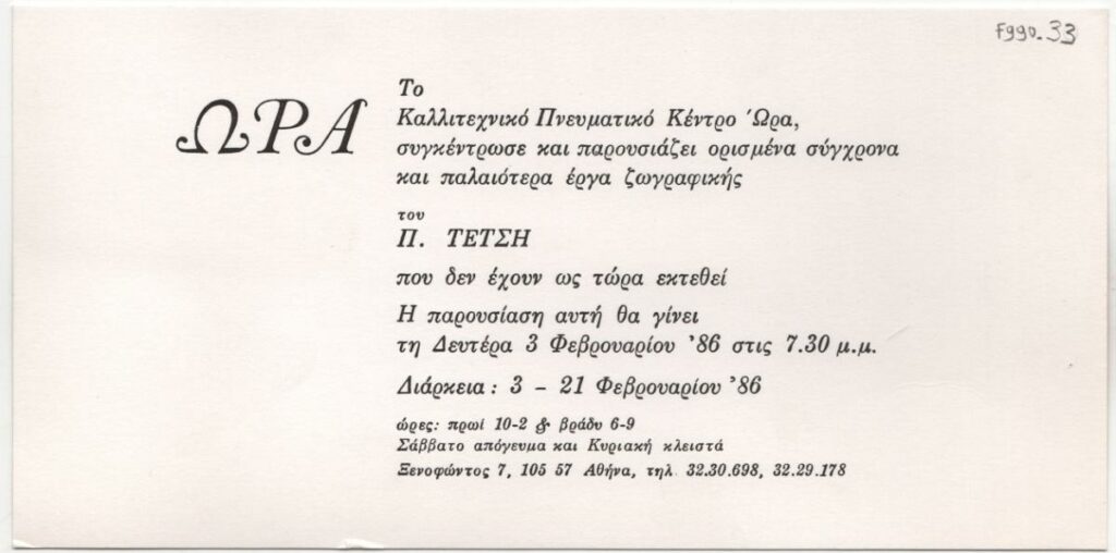 Πρόσκληση της ατομικής έκθεσης ζωγραφικής του Παναγιώτη Τέτση στο Καλλιτεχνικό Πνευματικό Κέντρο “Ώρα” στην Αθήνα.