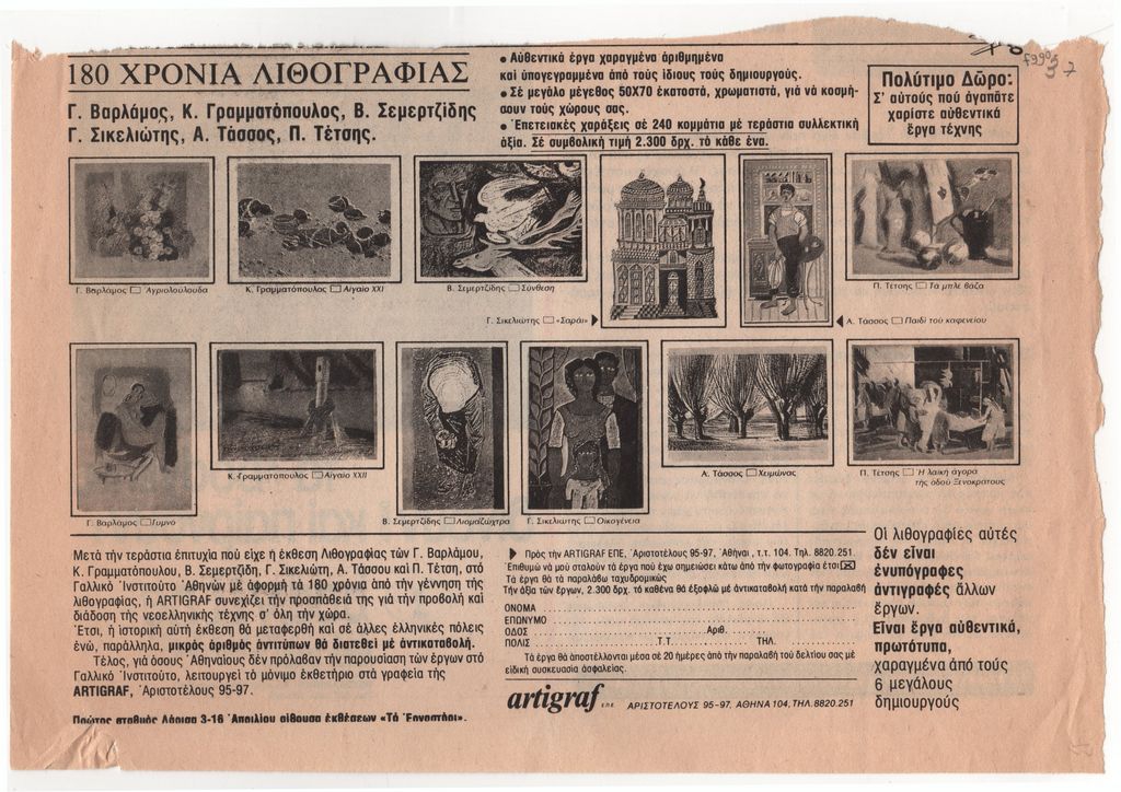Απόκομμα, έντυπο, χαρτί, 16,5×23,5 εκ. όπου δημοσιεύεται διαφήμιση της εταιρίας ARTIGRAF για την πώληση αντιτύπων λιθογραφικών του Γ. Βαρλάμου, Κ. Γραμματόπουλου, Β. Σεμερτζίδη, Γ. Σικελιώτη, Α. Τάσσου και Π. Τέτση που παρουσιάστηκκαν σε έκθεση στο Γαλλικό Ινστιτούτο Αθηνών με αφορμή τα 180 χρόνια από την γέννηση της λιθογραφίας.