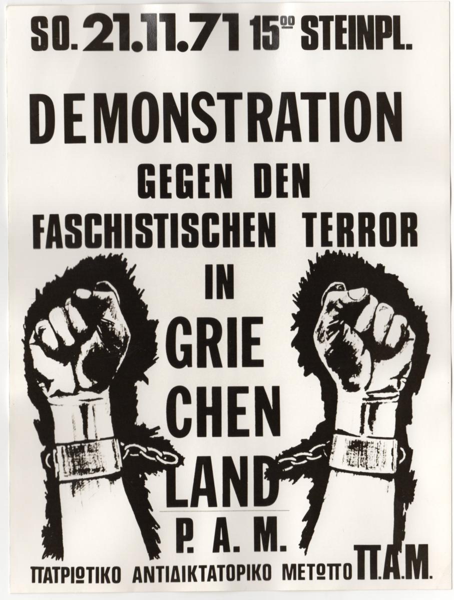 Ασπρόμαυρη εκτυπωμένη φωτογραφία αφίσας [του χαράκτη Γιώργου Αργυράκη;] για αντιφασιστική διαδήλωση που διοργανώθηκε από το Πατριωτικό Αντιδικτατορικό Μέτωπο Π.Α.Μ. στο Βερολίνο. Στην πίσω όψη επιγραφή.